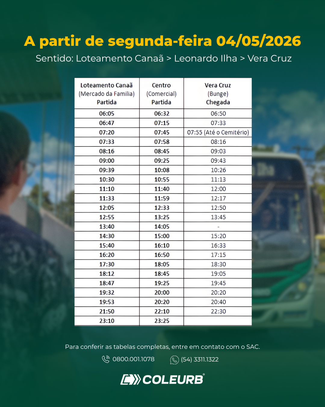 A partir de segunda-feira, 04 de maio, a linha L27| Loteamento Canaã - Leonardo Ilha – Vera Cruz terá ajustes na tabela de horários em dias úteis, principalmente nos turnos da tarde e noite.