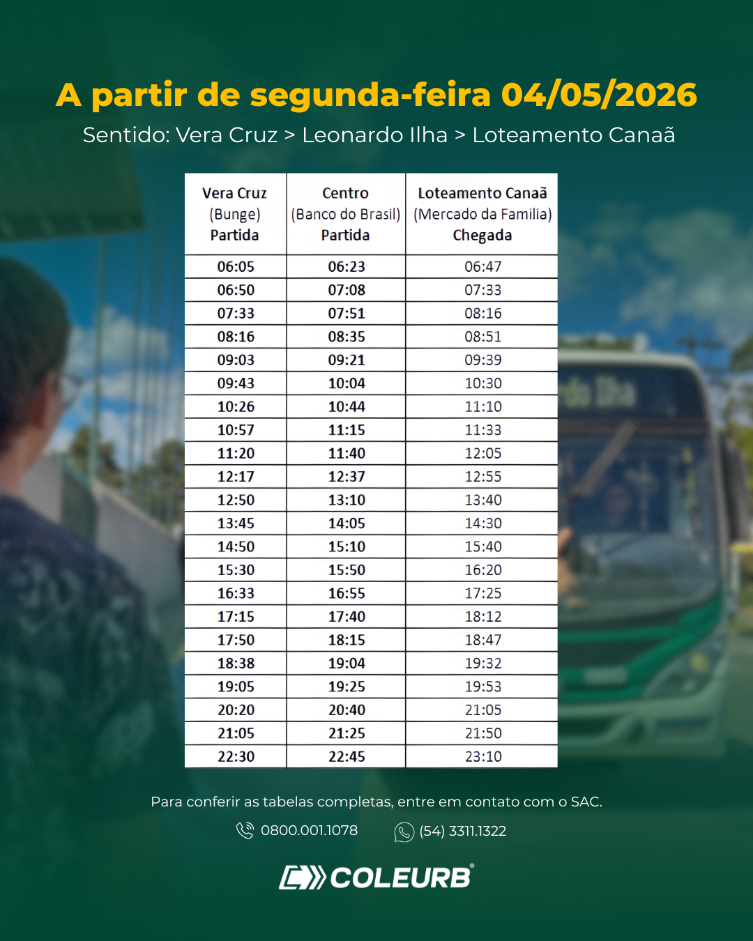 A nova tabela pode ser conferida nas imagens, e para mais informações, o passageiro pode entrar em contato pelo WhatsApp (54) 3311-1322 ou ligar para 0800.001.1078.